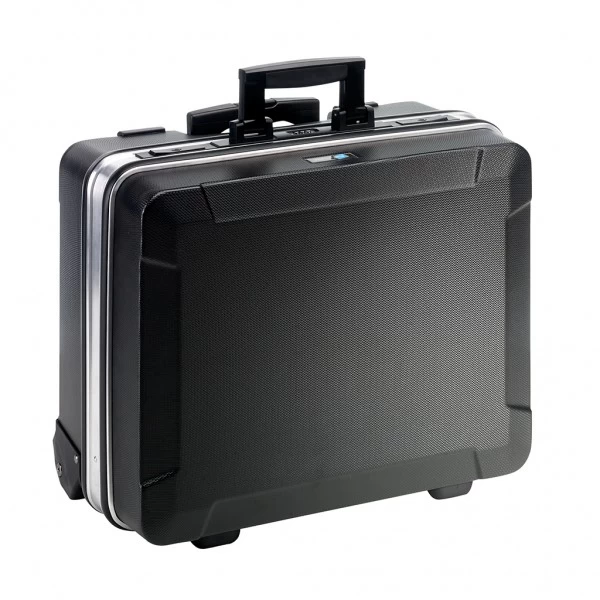 Mobiler Werkzeugkoffer aus ABS-Material mit anwendungsfreundlichem Teleskopgriff und 2 Inline-Rollen