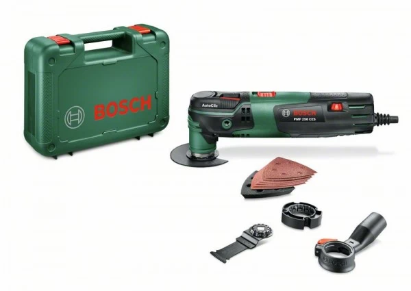 Multifunktionswerkzeug PMF 250 CES. Vielseitige, komfortable Lösung zur Bewältigung verschiedenster DIY-Projekte. Leistungsstarker 250-W-Motor mit elektronischer Drehzahlvorwahl. Bosch AutoClic-System ermöglicht schlüssellosen Zubehörwechsel innerhalb von 3 Sekunden. Es ist umfangreiches Starlock-Zubehör für vielfältige Anwendungen erhältlich. Staubabsaugvorsatz sorgt für mehr Sauberkeit im Arbeitsbereich. Schneiden, Sägen, Schleifen, Schaben, Fräsen, Raspeln und Polieren verschiedenster Materialien. Im Lieferumfang enthalten: BIM Segmentsägeblatt Wood and Metal, 85 mm, ACZ 85 EB (2 609 256 943), Deltaschleifplatte 93 mm, AVZ 93 G (2 609 256 956), Deltaschleifblatt-Set (2 609 256 A54), Staubabsaugung (2 609 256 D57), HCS Tauchsägeblatt Holz, 32 x 40 mm, AIZ 32 EPC (2 609 256 947), 4-stufiger Tiefenanschlag für Segmentsägeblätter (2 609 256 C61), Tragekoffer