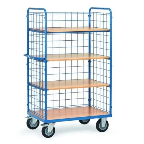 Baukasten-System: Stahlrohr und Profilstahl geschweiĂt, pulverbeschichtet blau RAL 5007, Schraubkonstruktion. 1 fester und 3 Einlegeböden aus tragfĂ€higen, biegesteifen Sandwich-Platten, OberflĂ€che Buchendekor. Einlegeböden variabel einsetzbar, Teilung 100 mm. Tragkraft pro Einlegeboden 90 kg. BerĂ€derung: 2 Lenk- und 2 Bockrollen, Vollgummi-Bereifung 200 x 50 mm, Naben mit Rollenlager. Feststeller an den Lenkrollen, gemÀà der EuropĂ€ischen Norm EN 1757-3 (Sicherheit von Plattformwagen). StirnwĂ€nde und eine LĂ€ngswand geschlossen mit Drahtgitter 100 x 100 x 5 mm.