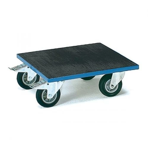 Aus Winkelstahl, mit Holz-Plattform mit Riefengummi, geschweiĂt, pulverbeschichtet blau RAL 5007, Holzplattform mit Riefengummi bespannt, 4 Lenkrollen mit Vollgummi-Bereifung, Naben mit Rollenlager. 2 StĂŒck mit Feststeller, gemÀà der EuropĂ€ischen Norm EN 1757-3.