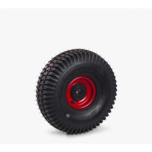 Schwarze Luftreifen auf Stahlblech-oder Kunststoff-Felgen, Naben mit Rollenlager.