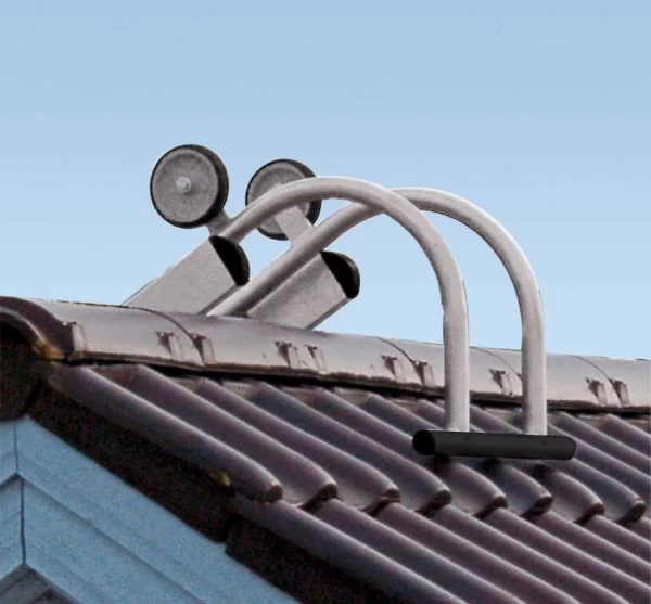 Mit den montierten Laufrollen können Sie die Anlegeleiter bequem zum First rollen, umdrehenund sicher einhängen.