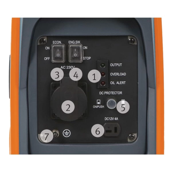 - Kontrollleuchten fĂĽr Ausgangsspannung, Ăśberlastung und Ă–lmangel