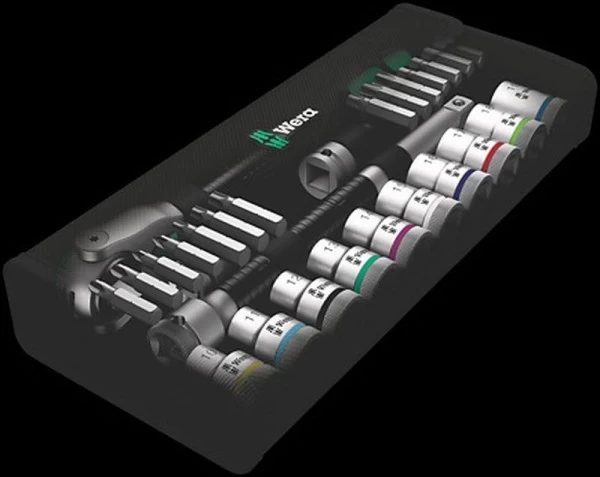 – 1x 8100 SC 6 Zyklop Speed-Knarrensatz, 1/2″-Antrieb, metrisch, 28-teilig; 1x 8000 C Zyklop Speed-Knarre mit 1/2″-Antrieb: 1/2″x277.0; 10x 8790 HMC Zyklop-SteckschlĂĽsseleinsatz mit 1/2″-Antrieb: 10.0×37.0, 11.0×37.0, 12.0×37.0, 13.0×37.0, 14.0×37.0, 15.0×37.0, 16.0×37.0, 17.0×37.0, 18.0×37.0, 19.0×37.0; 1x 8794 LC Zyklop-Verlängerung mit SchnelldrehhĂĽlse, lang, 1/2″: 1/2″x250.0; 1x 8794 C Zyklop-„Wobble“-Verlängerung, 1/2″: 1/2″x52.0; 1x 8784 C2 Zyklop-Verbindungsteil, 1/2″, 5/16″: 5/16×1/2″x50.0; 2x 851/2 Z Bits: PH 2×32, PH 3×32; 2x 855/2 Z Bits: PZ 2×32, PZ 3×32; 6x 867/2 Z TORX® Bits: TX 20×35, TX 25×35, TX 30×35, TX 40×35, TX 45×35, TX 50×35; 4x 840/2 Z Bits: 5×30, 6×30, 8×30, 10×30