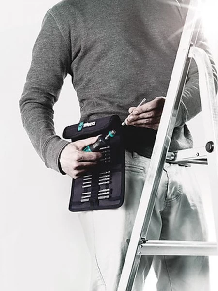 Falttasche zur Befestigung am Gürtel mit 89 mm langen Bits. Inklusive Handhalter 816 R Kraftform mit Schnellwechselfutter „Rapidaptor“ und mehrkomponentigem Kraftform-Griff für ermüdungsarmes Arbeiten. Für hand- und maschinenbetätigte Verschraubungen geeignet. 33-teilig.